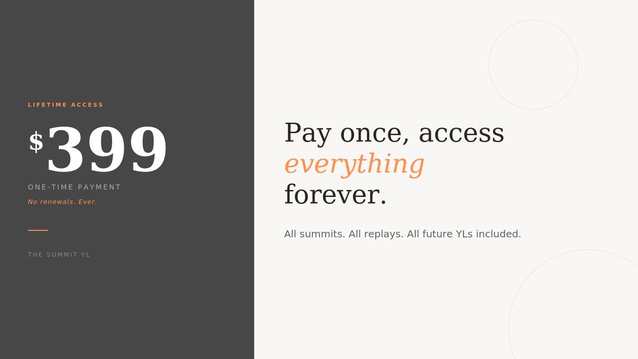 Enjoy lifetime access to the 2026 Summit + Animal Summit — forever. Lifetime access to every past Summit replay. Lifetime Summit Community membership. All future Summit YLs included — no extra charge. No renewals. Ever.