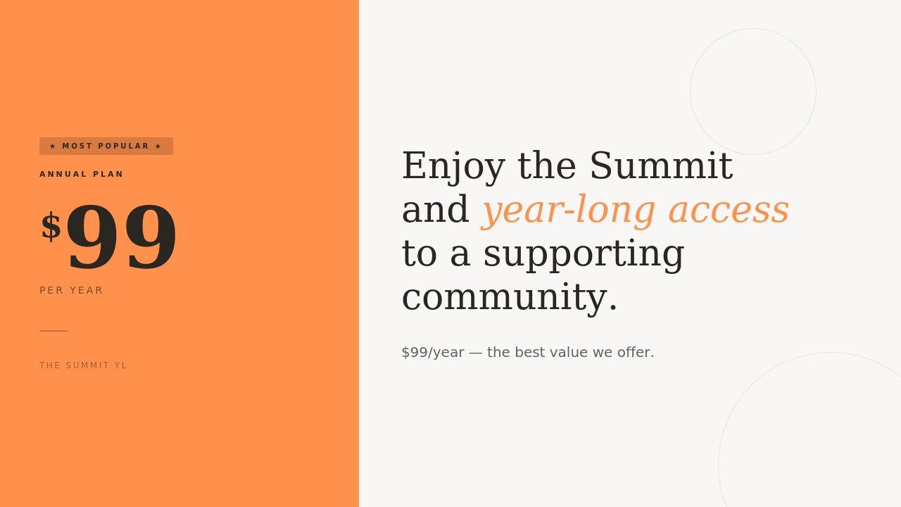 Enjoy full access to the 2026 Summit + Animal Summit — live or on-demand. Full year access to ALL past Summit replays. Full-year access to the Summit Community. Access to future Summit YLs for just $99